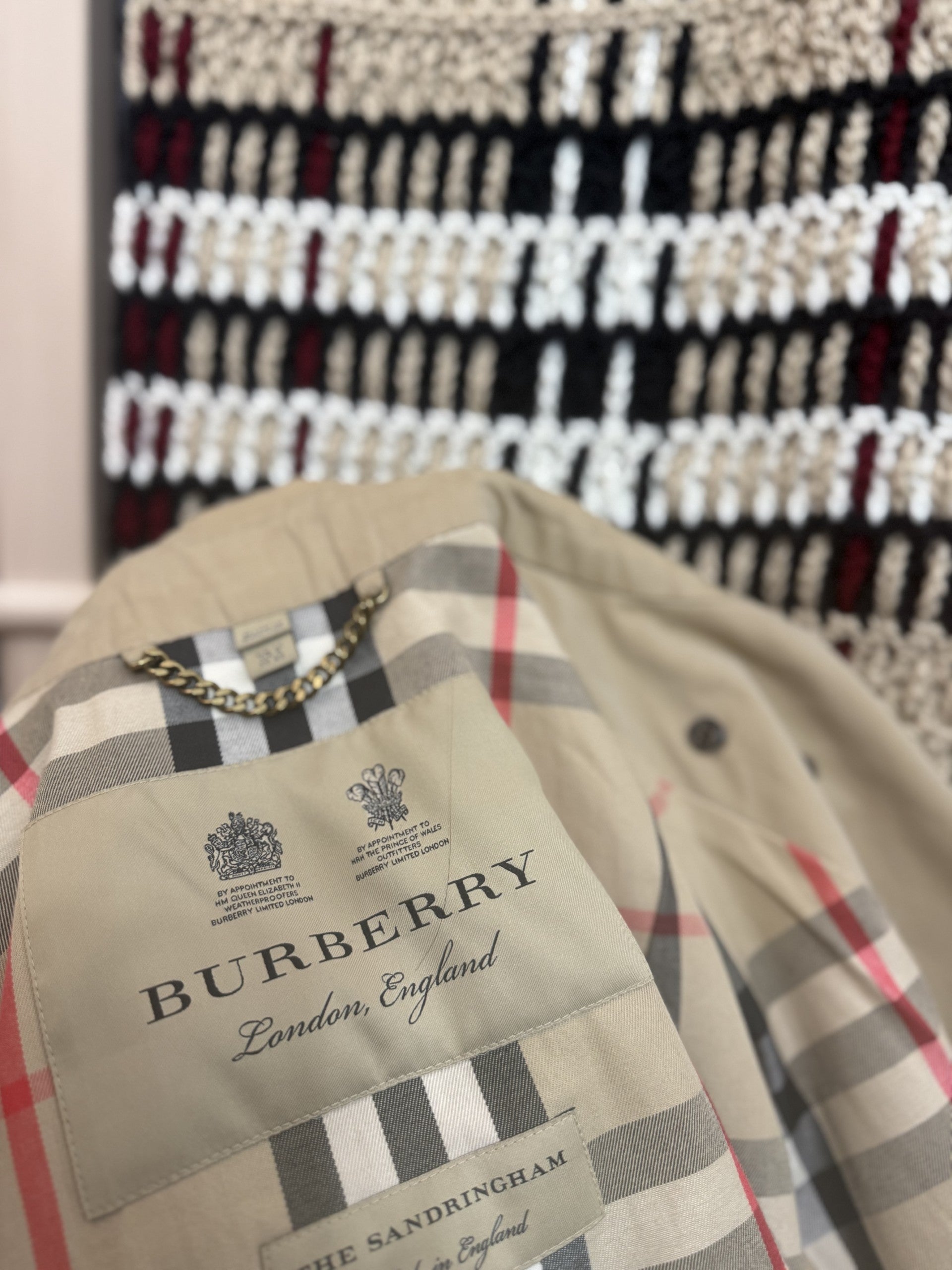 Estola inspirada en las líneas clásicas de Burberry, reinterpretada en ganchillo.